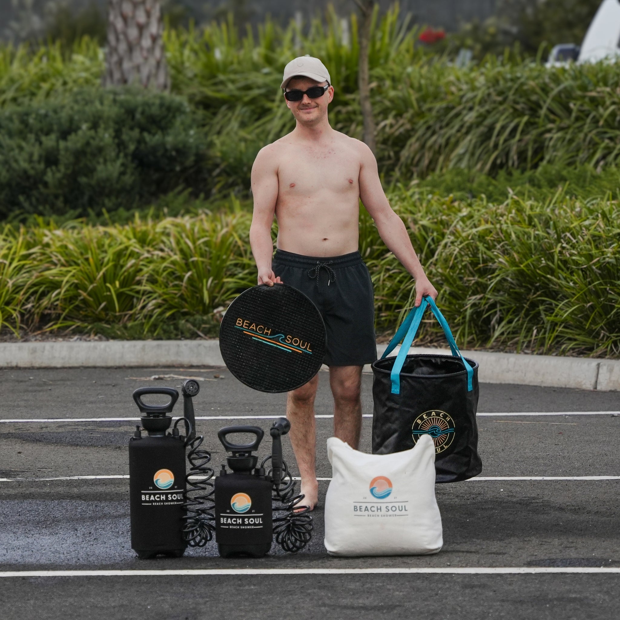 All the tools, one tidy kit. Whether it’s a rinse, a stash, or a carry — our Beach Soul essentials work better together. With your shower, holder, Bag ‘n’ Mat and beach bag in tow, you’re packed, prepped, and free to chase good vibes from beach to bush and back again.