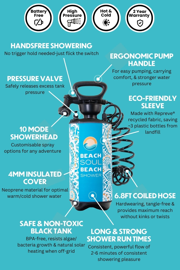 With up to 6 minutes of pressurized flow, it’s perfect for beach sessions, camp days, or wherever the good times roll. Easy to carry, fun to use, and guaranteed to leave you smiling — this one’s for lovers of style, sunshine, and salty skin.