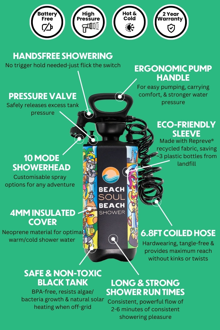 Enjoy the Outdoors with Total Shower Freedom: This color-loving, rinse-ready, high-pressure portable shower is made for bold adventures, sandy feet, & clean-ups with extra splash & style.