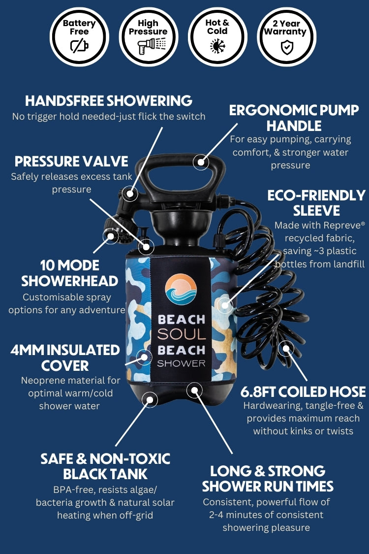 Flick the water switch to instantly de-sand, de-salt & de-stress your daily adventures & enjoy true shower freedom!