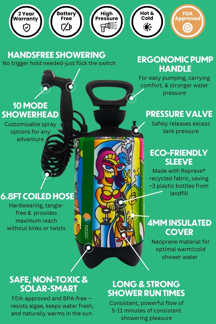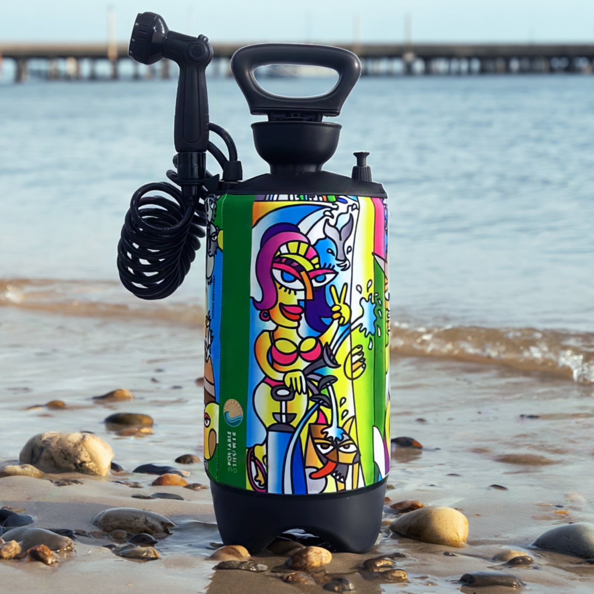 This limited edition portable shower is packed with vibrant artwork, strong performance, and no-fuss outdoor function — perfect for those who like their showers bold and full of personality.