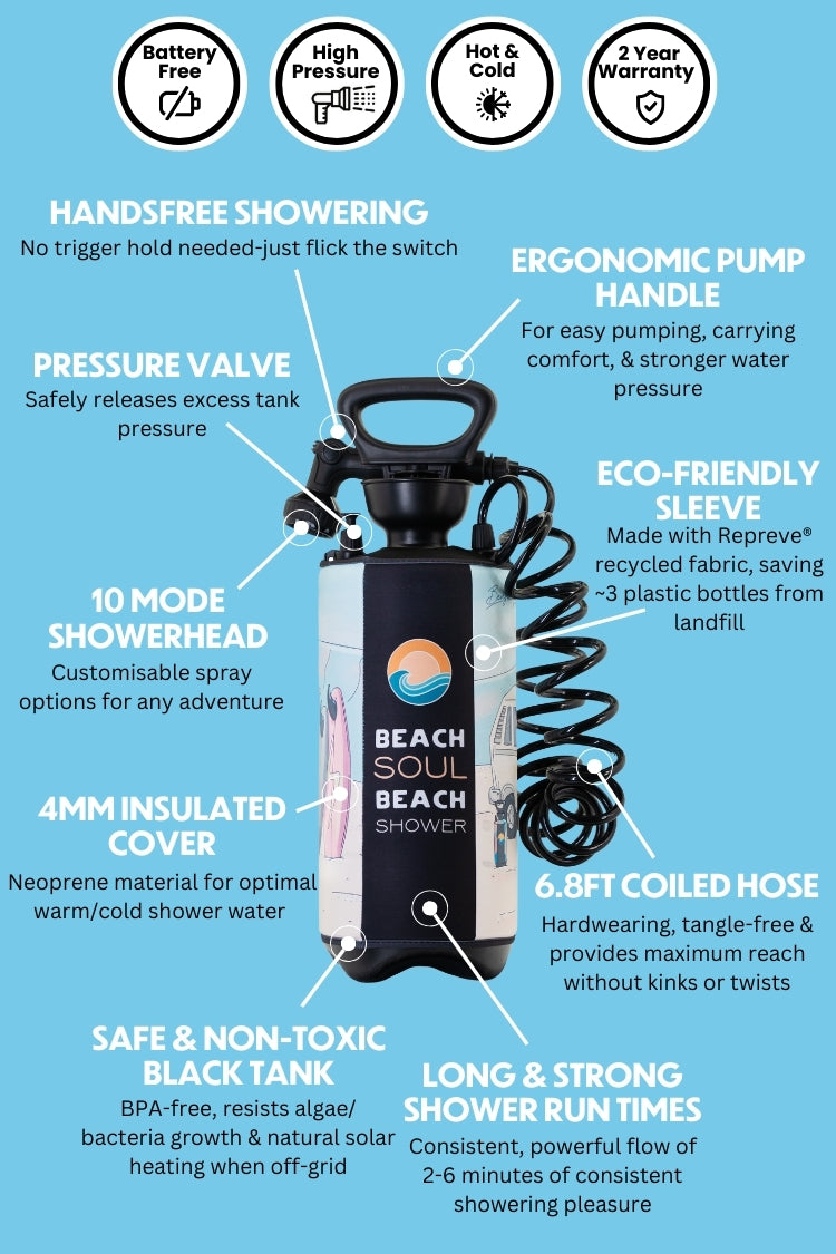 Inspired by surf sessions, beach hangs, and firepit chats, this 2.1G pressurized shower keeps the good vibes going — wherever the day takes you.